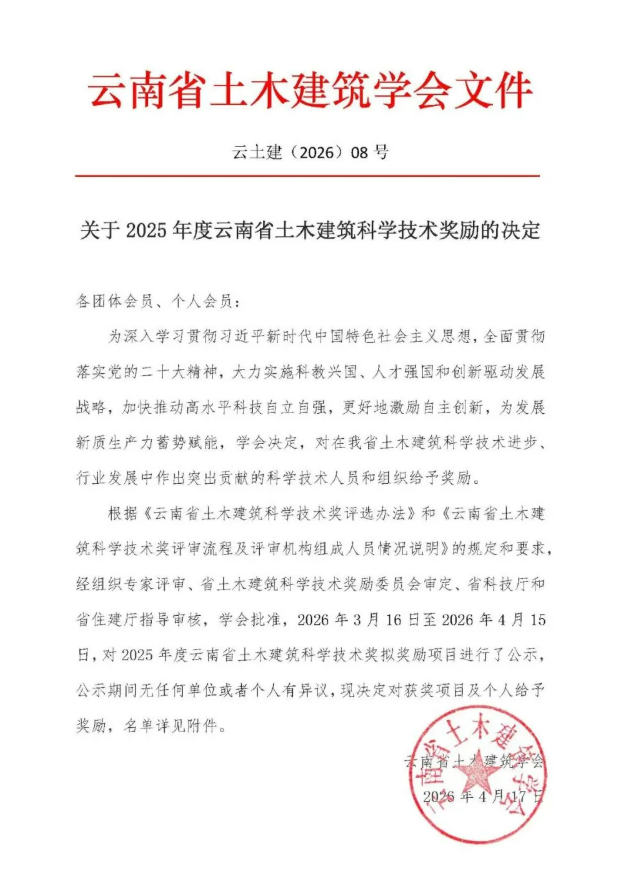 4月17日,云南省土木建筑科學技術獎勵委員會正式公布2025年度云南省土木建筑科學技術獎勵項目(人)名單,集團憑借過硬的技術實力與豐碩的創新成果,榮獲多項榮譽,再添行業權威認可。